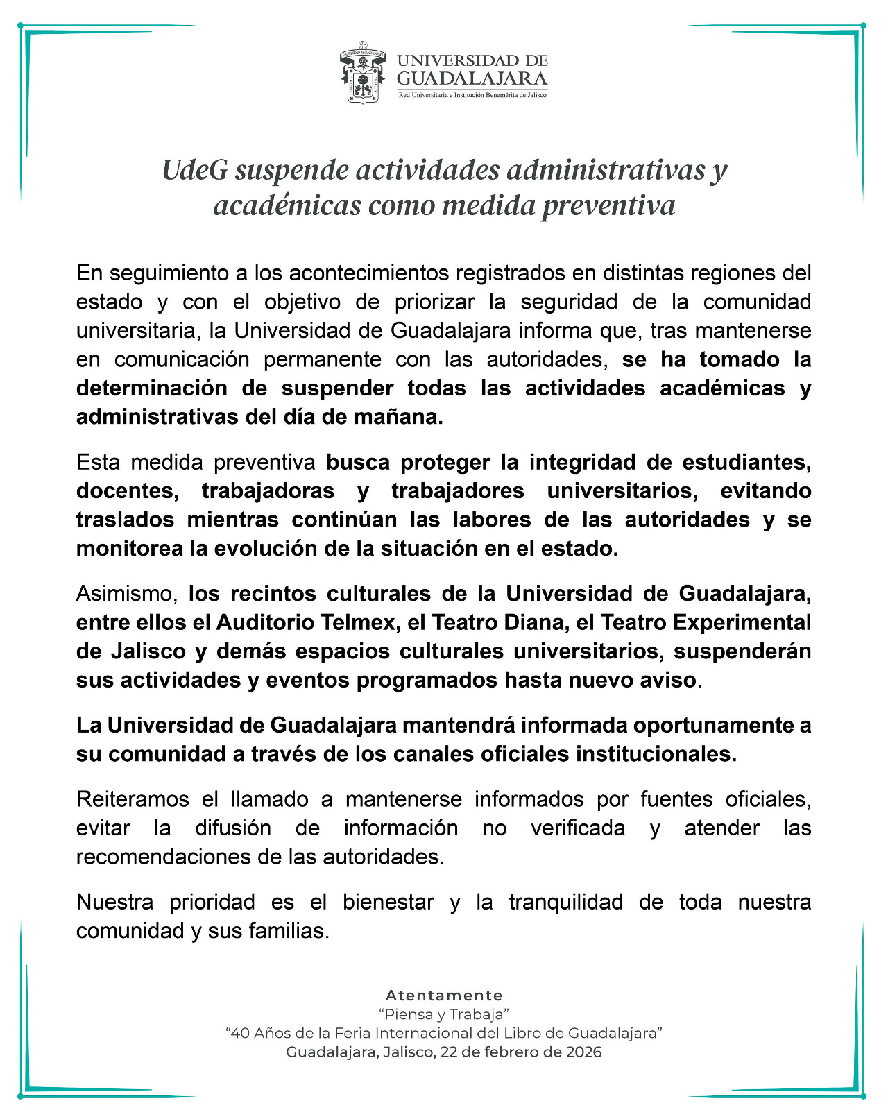 En seguimiento a los acontecimientos registrados en distintas regiones del estado y con el objetivo de priorizar la seguridad de la comunidad universitaria, la Universidad de Guadalajara informa que, tras mantenerse en comunicación permanente con las autoridades, se ha tomado la determinación de suspender todas las actividades académicas y administrativas del día de mañana.
